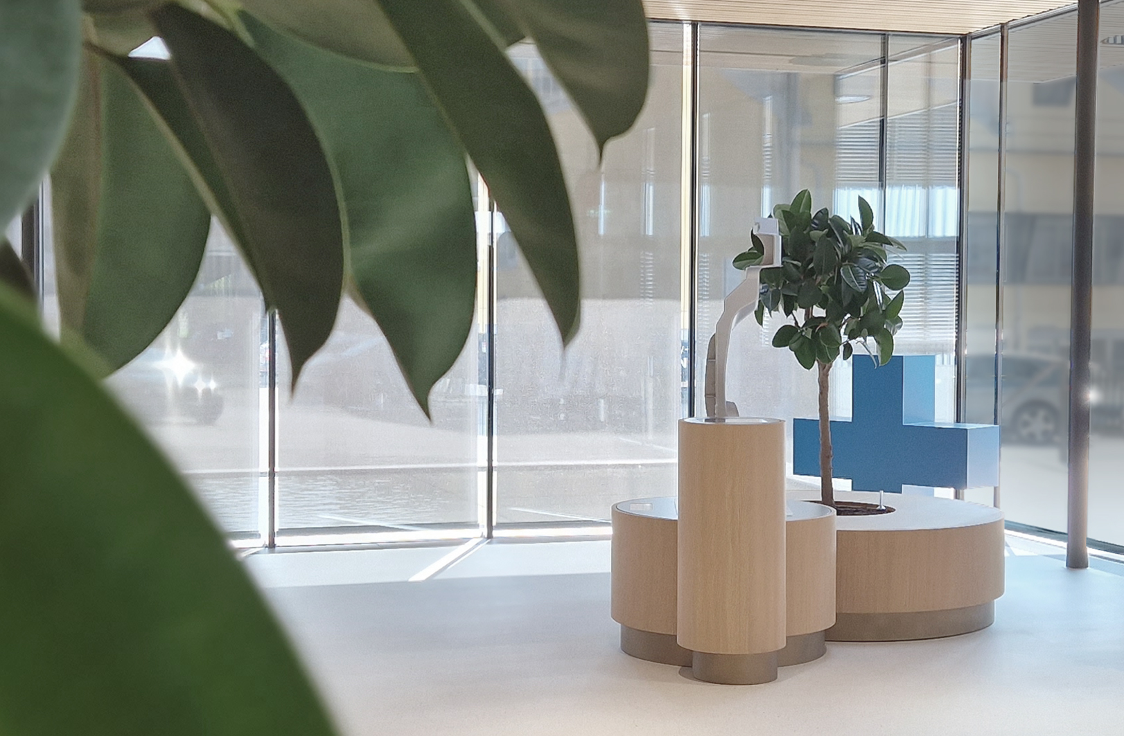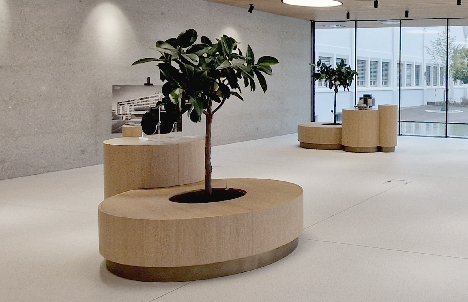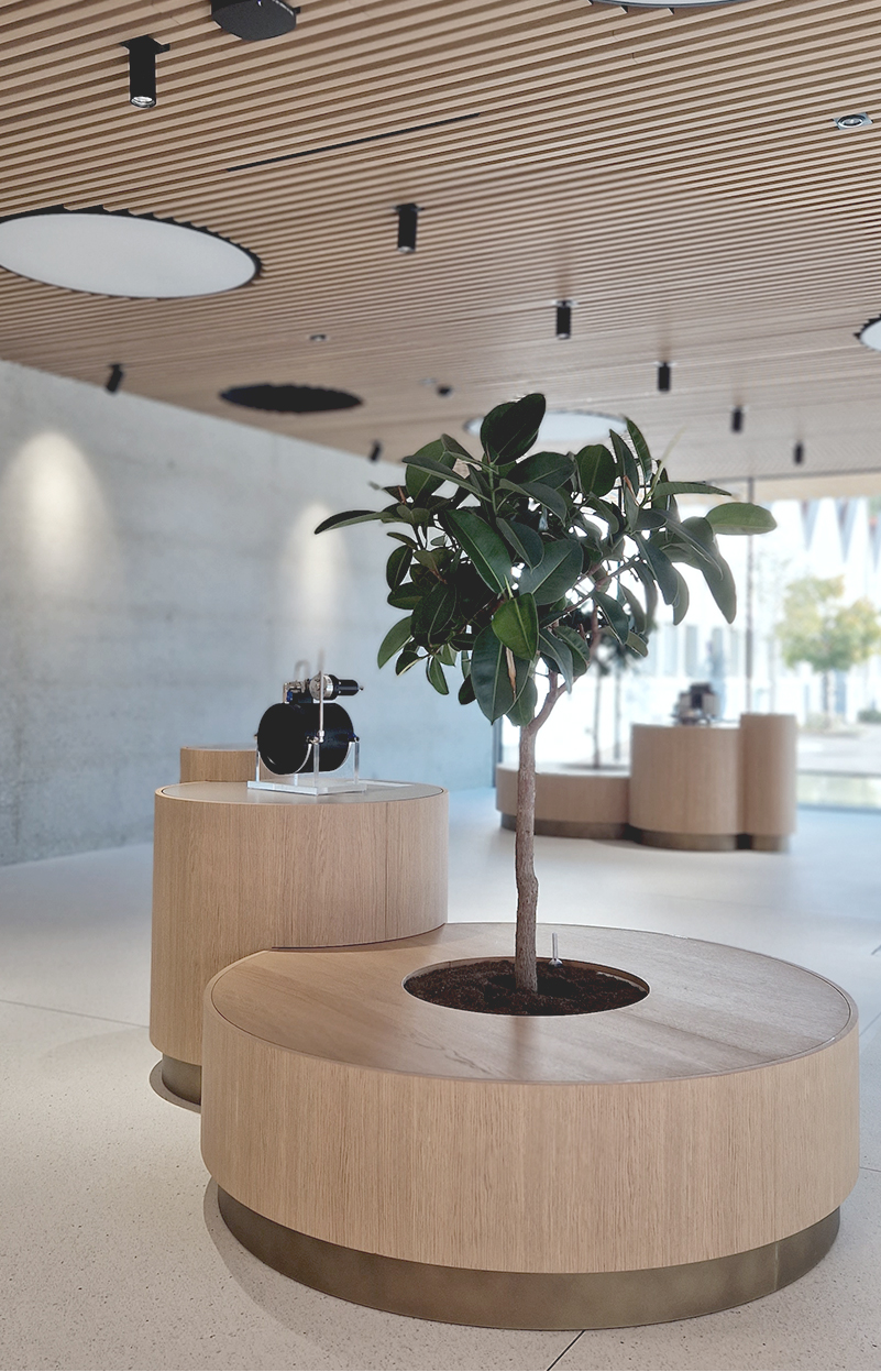 Inspiriert von der schönen Holzkurve des Empfangstresens zielt unser Design darauf ab, nicht nur einen Sockel für das Produkt selbst zu schaffen, sondern auch die Nachhaltigkeitsziele von GF- und die über 200-jährige Erfahrung hinter der Innovation zu inszenieren. Durch die Schaffung von drei ineinandergreifenden runden Elementen vereinen wir Produktpräsentation, einen interaktiven Informationspunkt und einen gemütlichen Sitzbereich im Grünen.