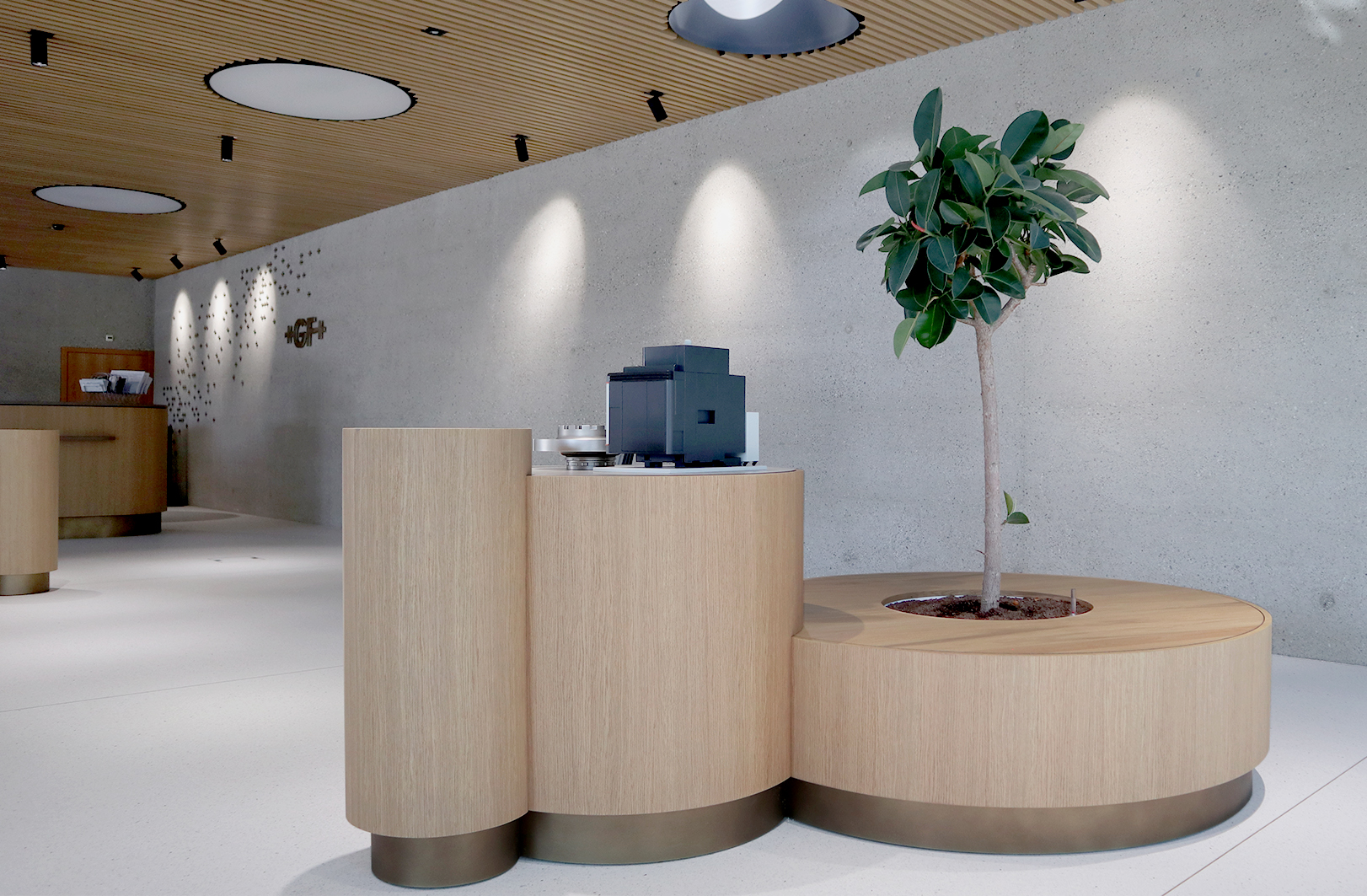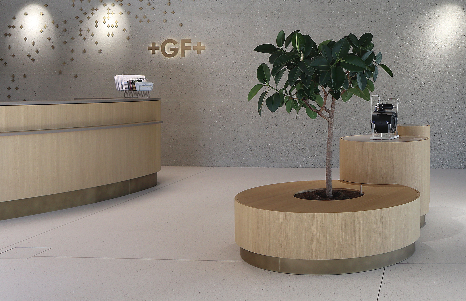 Prominent im Empfangsfoyer platziert und offen für zukünftige Entwicklungen, sollte jede Einheit mit neuen Innovationen und Produkten der GF-Abteilungen aktualisiert werden können. Unser Ansatz besteht darin, die unterschiedlichen Funktionen – Repräsentation, Produktpräsentation und Wartebereich – in einer ansprechenden Möblierung zusammenzuführen und wartende Besucher so direkt in die Ausstellung einzuladen.