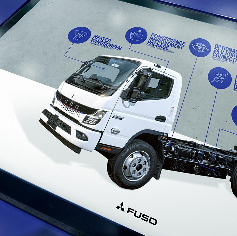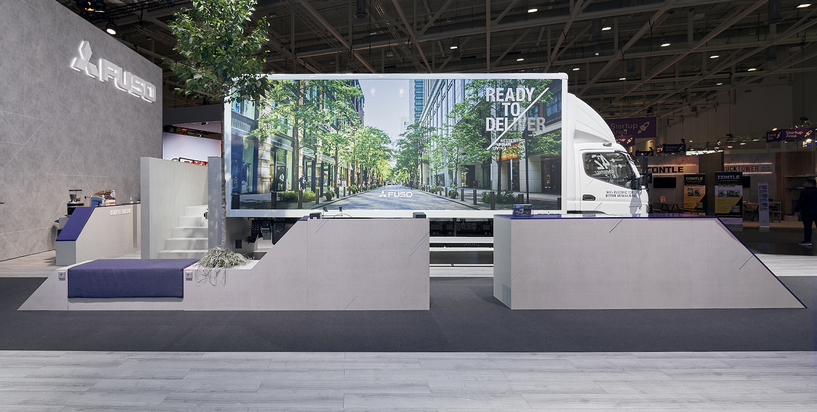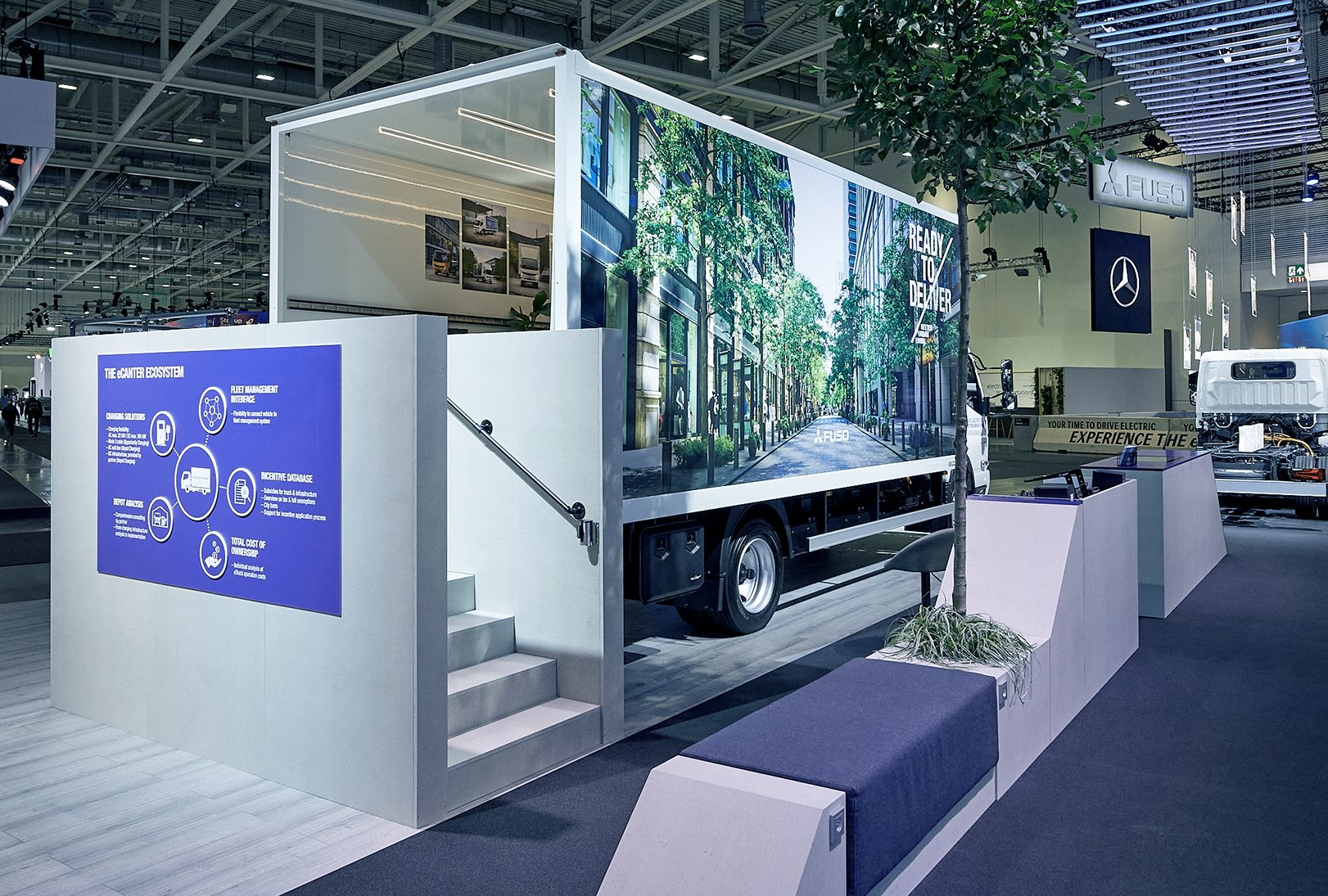 Wir wurden beauftragt, für FUSO ein wiederverwendbares Möbelkonzept zu entwerfen, das bei verschiedenen Veranstaltungen zur Markteinführung des Next Generation eCanter, dem bahnbrechenden elektrischen Lkw von FUSO, eingesetzt werden sollte.