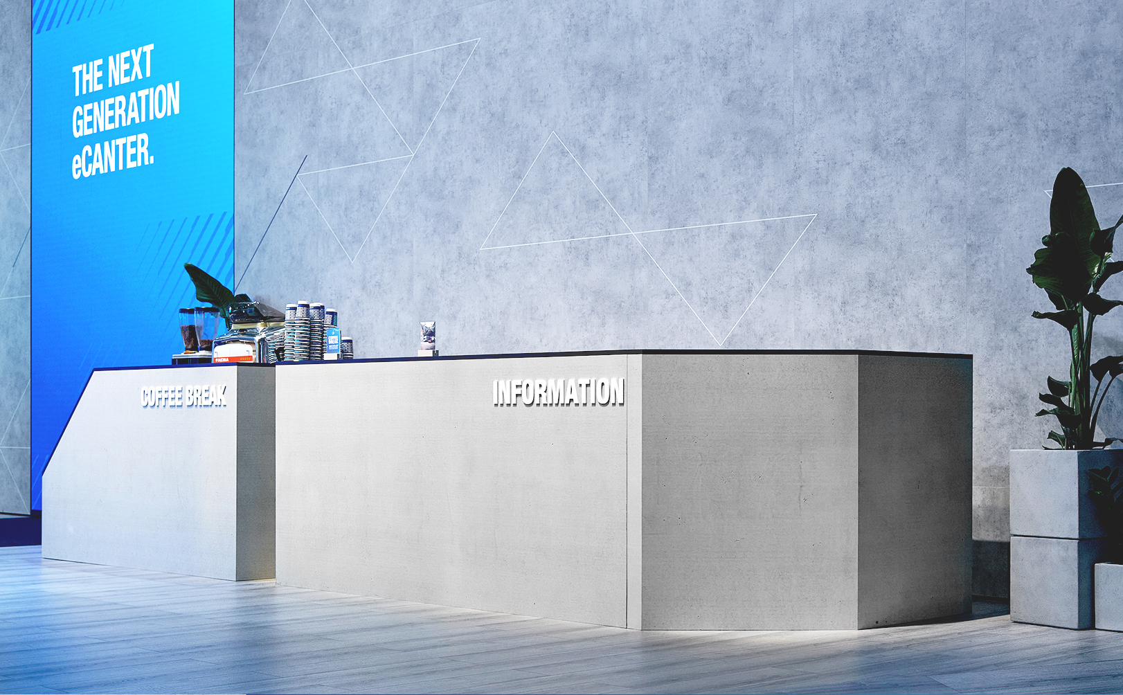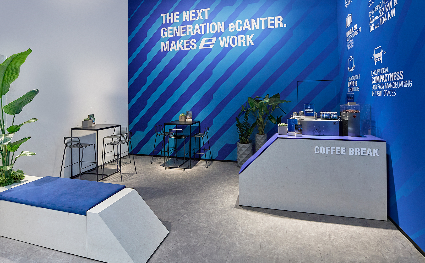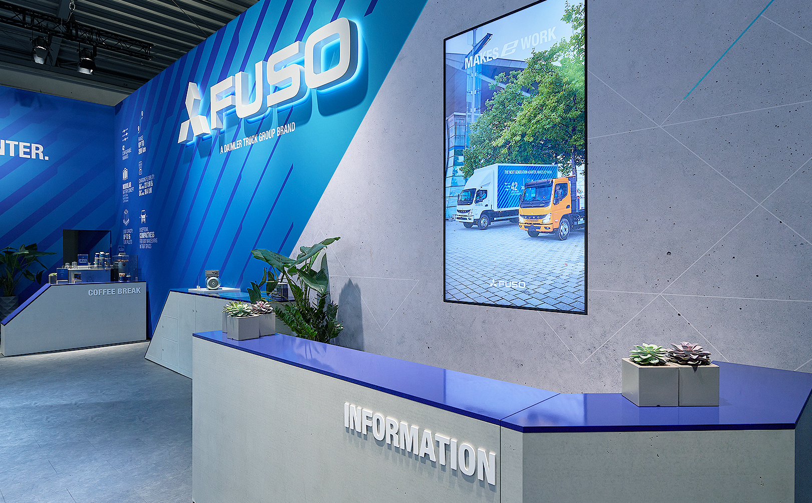 Wir wurden beauftragt, für FUSO ein wiederverwendbares Möbelkonzept zu entwerfen, das bei verschiedenen Veranstaltungen zur Markteinführung des Next Generation eCanter, dem bahnbrechenden elektrischen Lkw von FUSO, eingesetzt werden sollte.