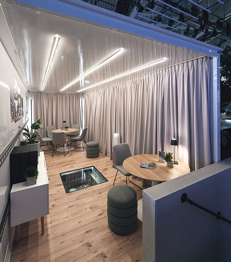 The theme of being economical and more sustainable also informed other spaces we designed for the client. One potential area of reuse was in the clients event meeting spaces. Rather than build more walls and meeting rooms, only to be removed and discarded after each event, why not use a pre-built structure? Here we designed a reusable meeting space in the box body of an eCanter itself, a space that will already be at the events.