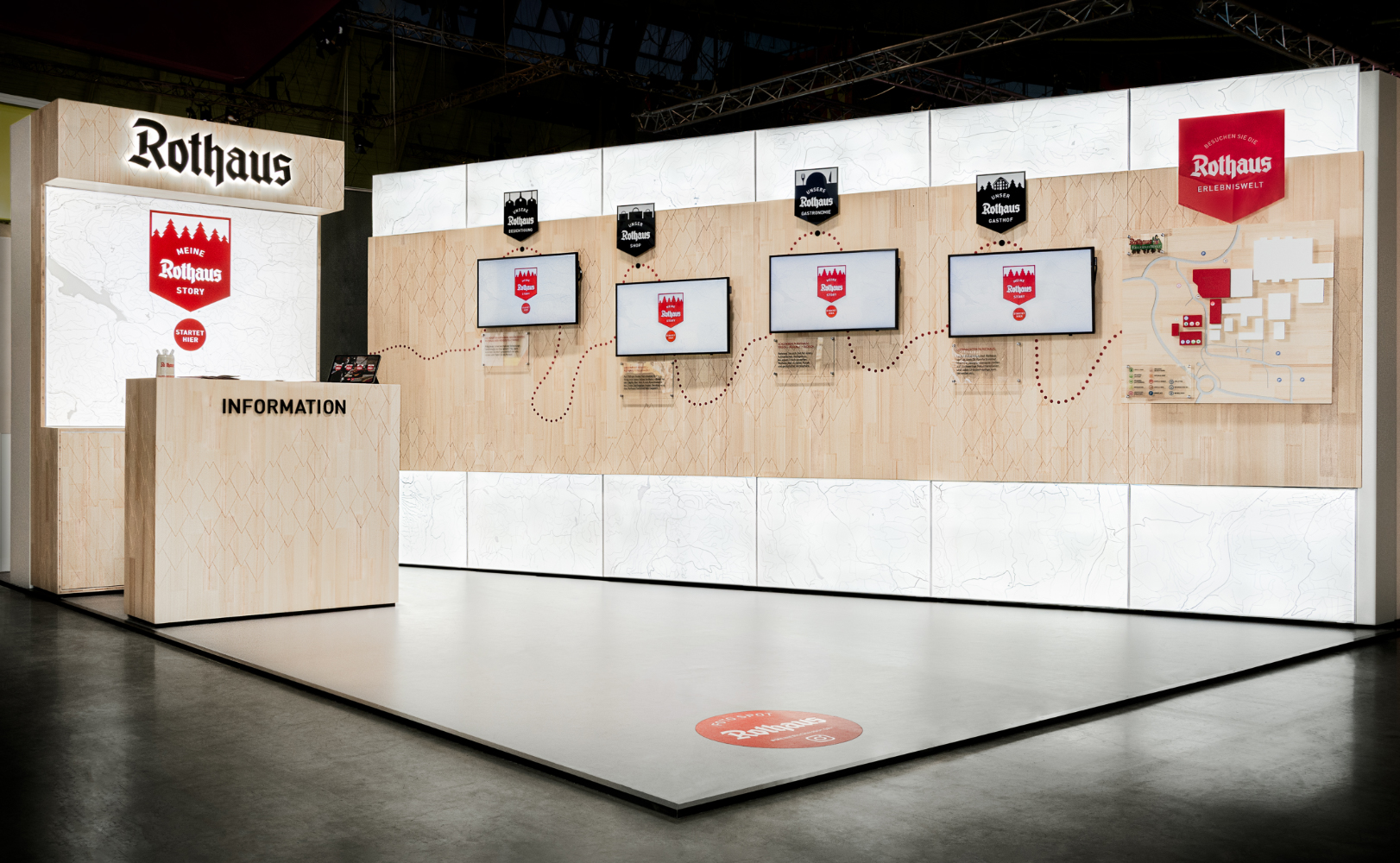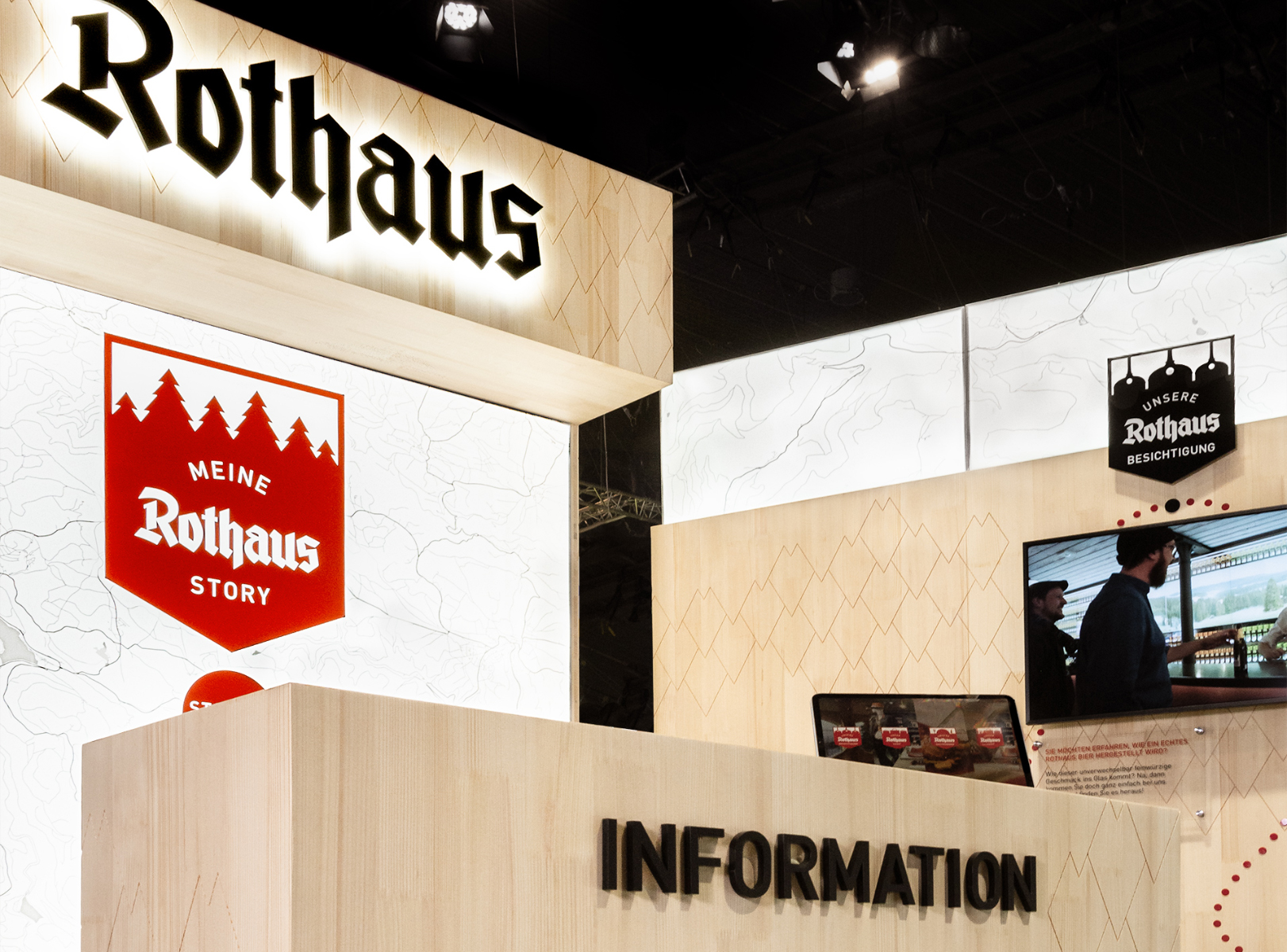 Ein klares und vielschichtes Standdesign lag im Fokus der Konzeption. Die Kombination aus natürlichen Materialien (Schwarzwald Tanne) und technischen Elementen (Plexiglas, Light-frames, LED Screens und 3D Typografien) repräsentierten dabei Rothaus als eine moderne und innovative Brauerei mit sehr traditionellen Wurzeln und einem klaren Bekenntnis zum Schwarzwald.