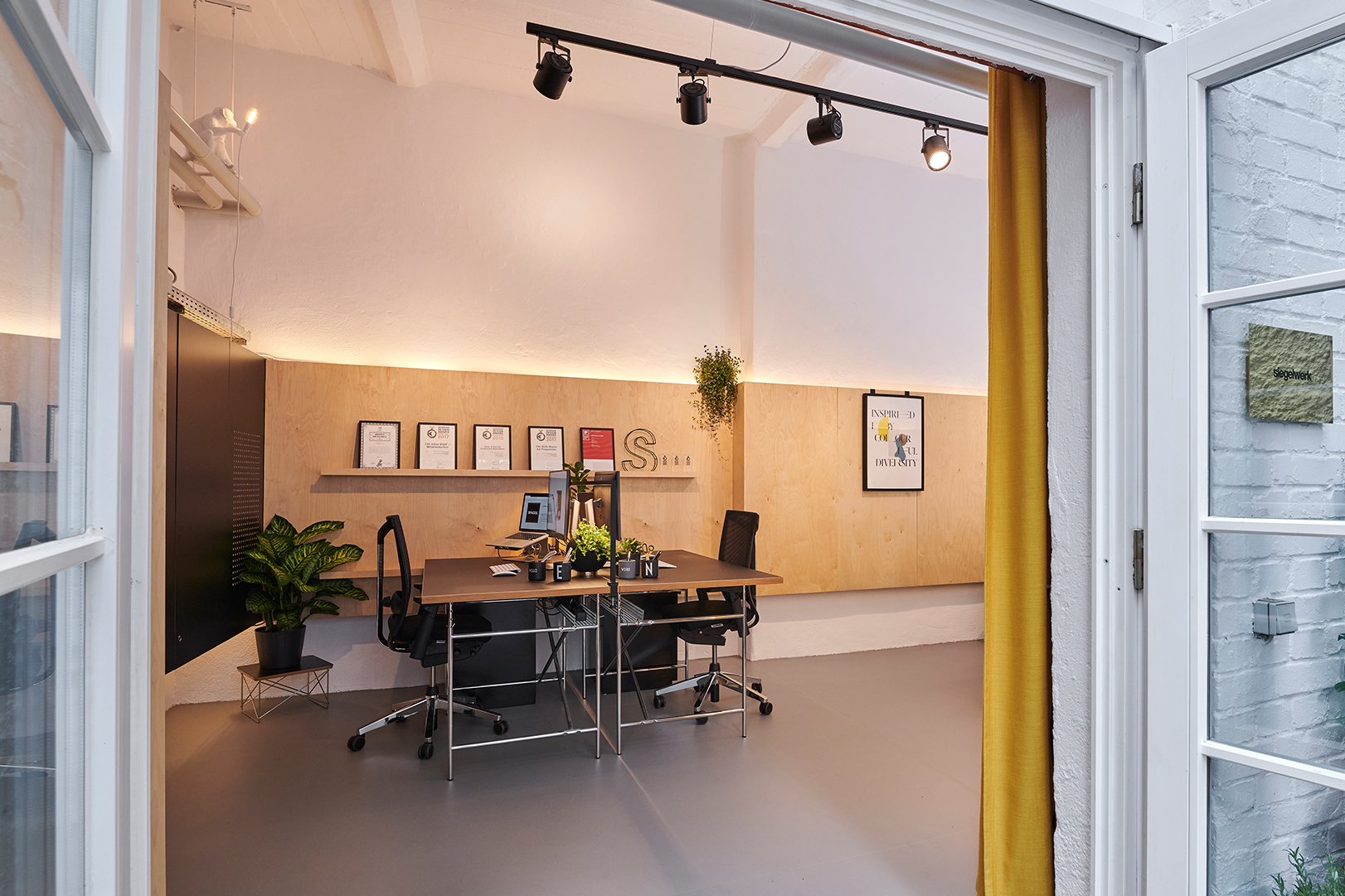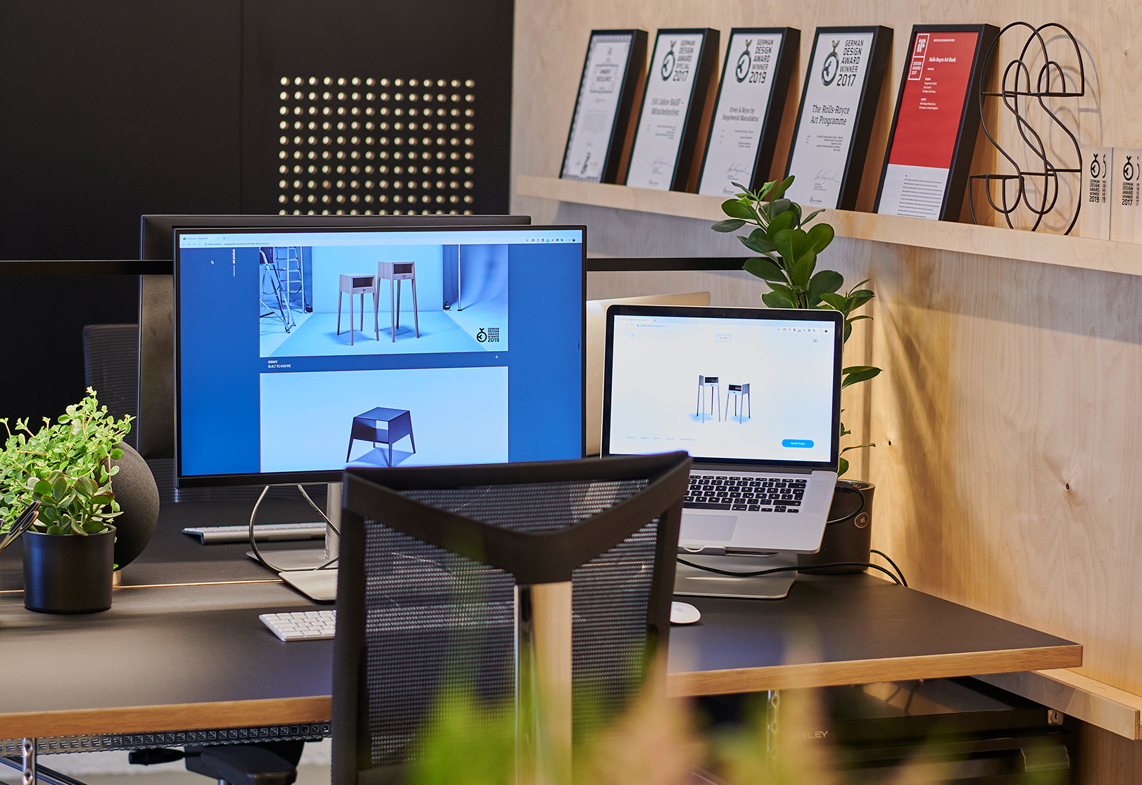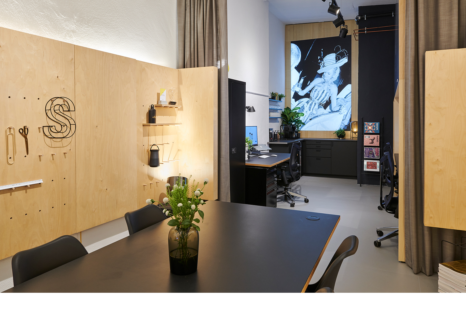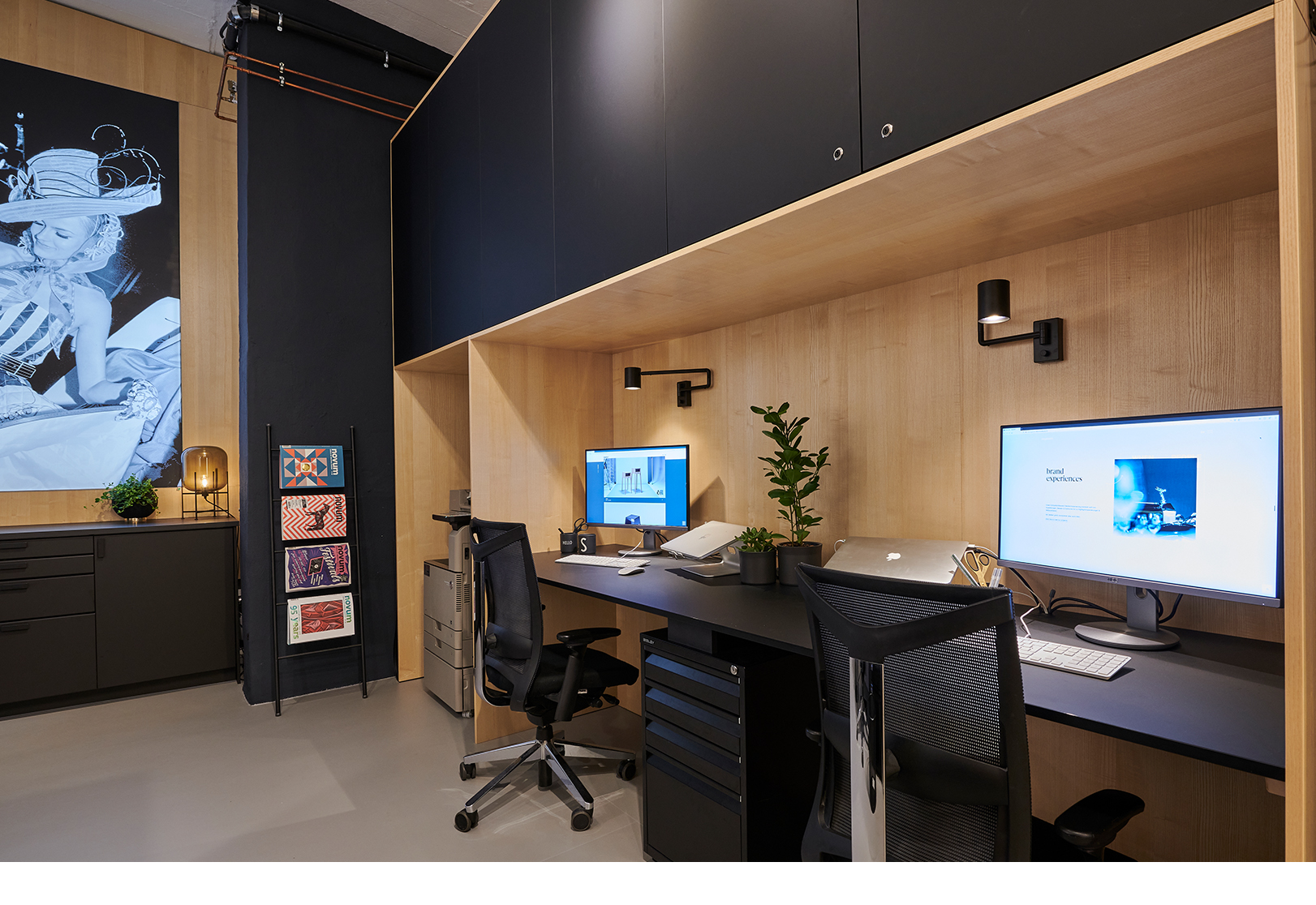 Einer unserer Hauptwerte als Designagentur: Wir sind herzlich und aufgeschlossen, erledigen unsere Arbeit aber auch professionell und kreativ. Natürlich sollte unser eigenes Studio dies widerspiegeln. Wir haben warme Naturholztöne gewählt und diese mit eleganten mattschwarzen Lackoberflächen ausgeglichen.