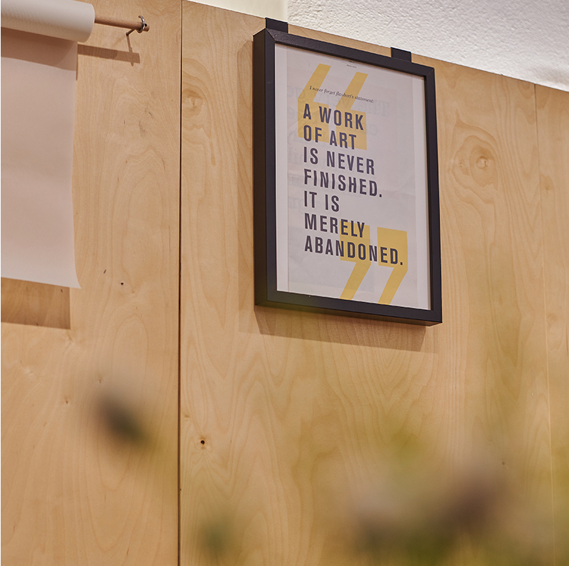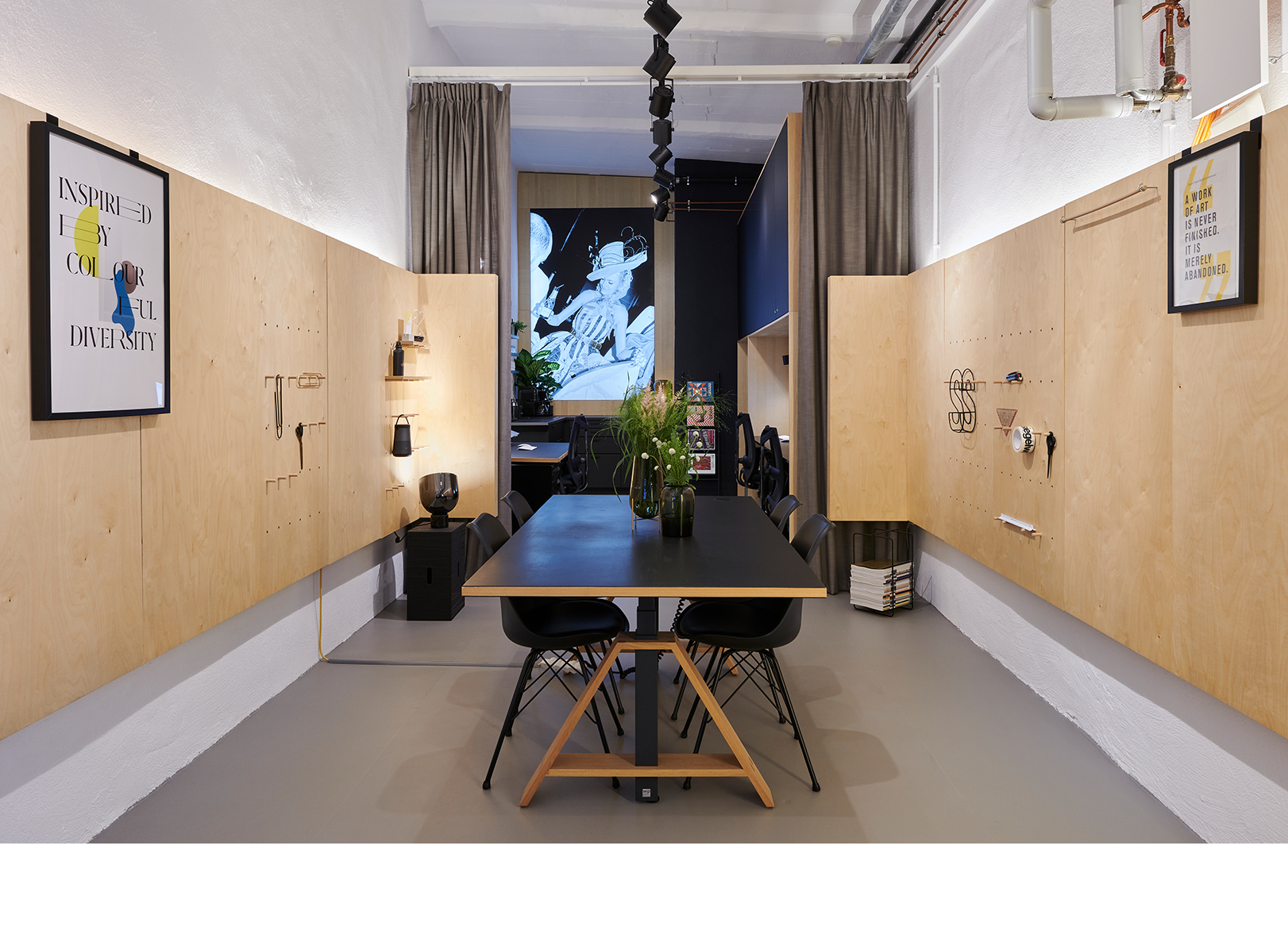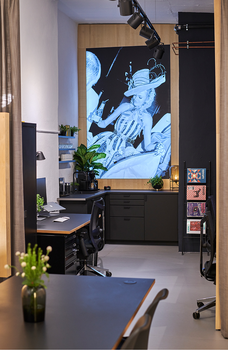 Es war uns wichtig, dass die Arbeitsplätze eine elegante und aufgeräumte Atmosphäre bekommen und gleichzeitig genug Freiraum für den kreativen Prozess lassen. Für alle Funktionselemente, wie Kabel, Drucker, Schreibwaren etc. gibt es Stauraumlösungen. Dadurch stehen uns offene, klare Panels und Oberflächen zur Verfügung, auf denen wir unsere kreativen Arbeiten, Muster und Moodboards präsentieren und diskutieren können.